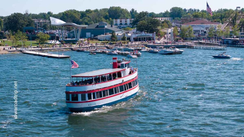 The Queen II offers narrated cruises around West Lake Okoboji, continuing the tradition of lake cruising in the Iowa Great Lakes..