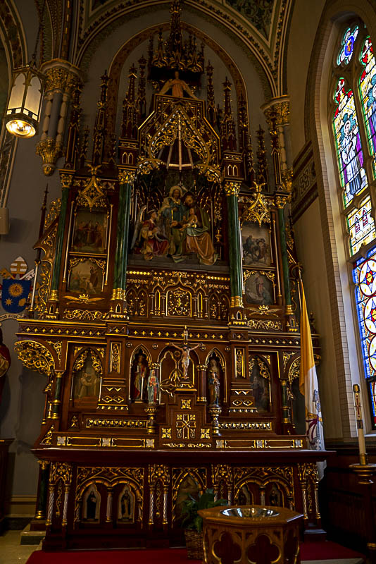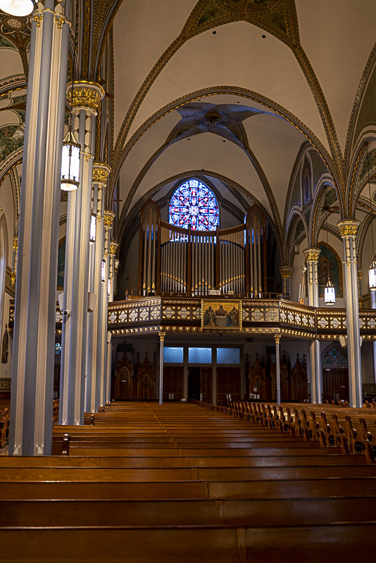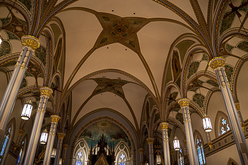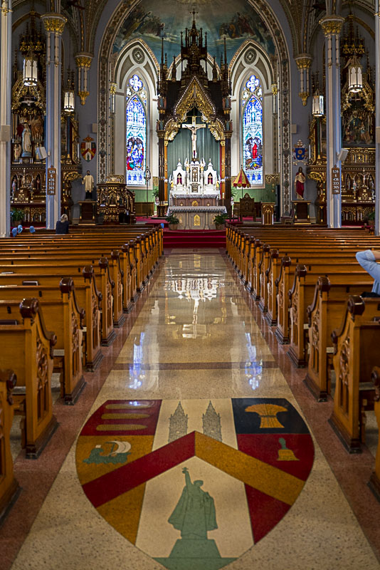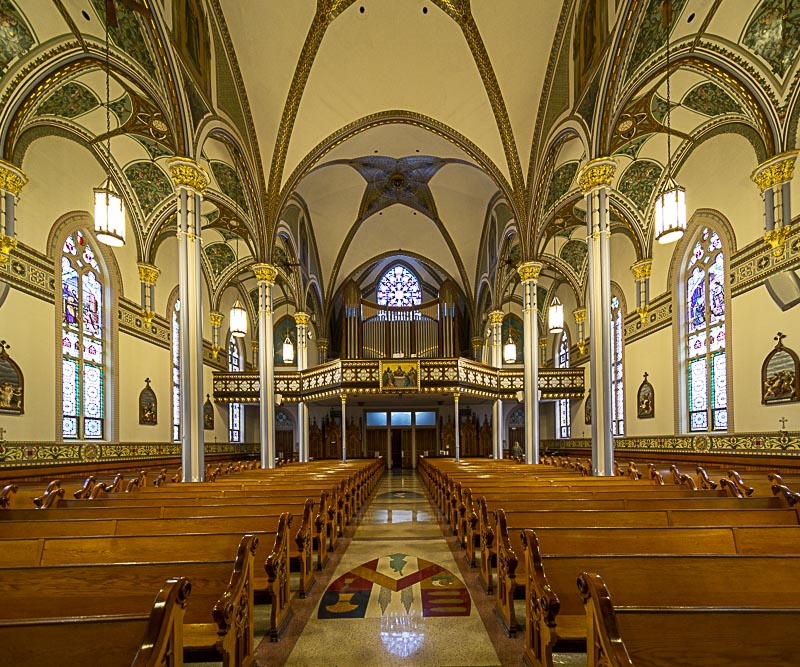 Inside, the soaring vaulted nave and rich architectural detailing reflect the deep faith and craftsmanship of the community that built it. The basilica can seat about 1,000 people, and its interior features a spectacular array of stained glass windows, sculptural detail, and decorative painting.